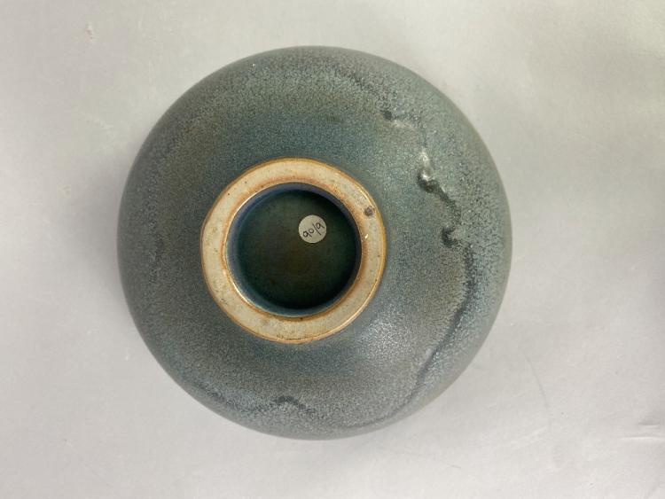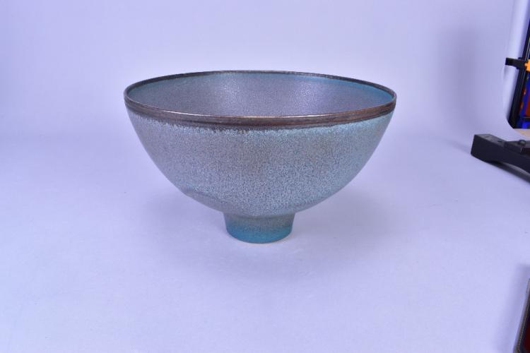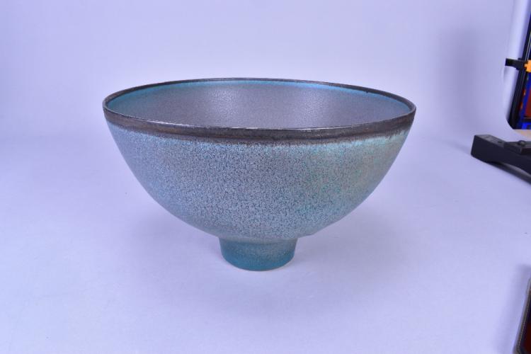 Lot 2 of 473: ABDO NAGI (1941-2001); a stoneware pedestal bowl covered in mottled blue glaze with bronze rim, made 1990, diameter 27cm. (D)