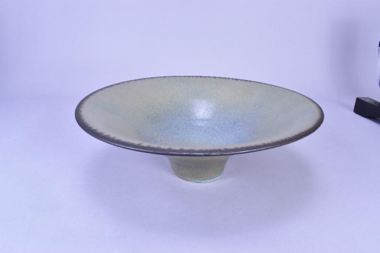 Lot 3 of 473: ABDO NAGI (1941-2001); a stoneware pedestal bowl covered in mottled green glaze with bronze rim, impressed mark, diameter 33.5cm. (D)