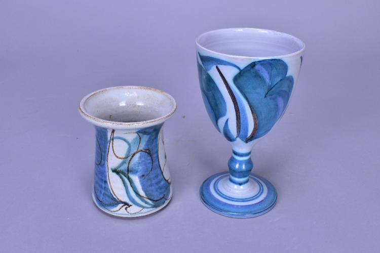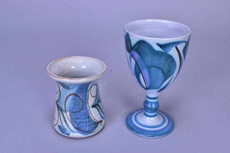 Lot 11 of 473: ALAN CAIGER-SMITH (1930-2020) for Aldermaston Pottery; a tin glazed earthenware goblet, painted ACS mark and date code, height 16cm, and a small Aldermaston vase (2). (D)
