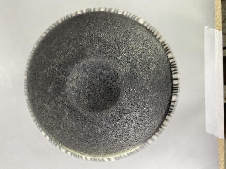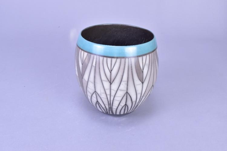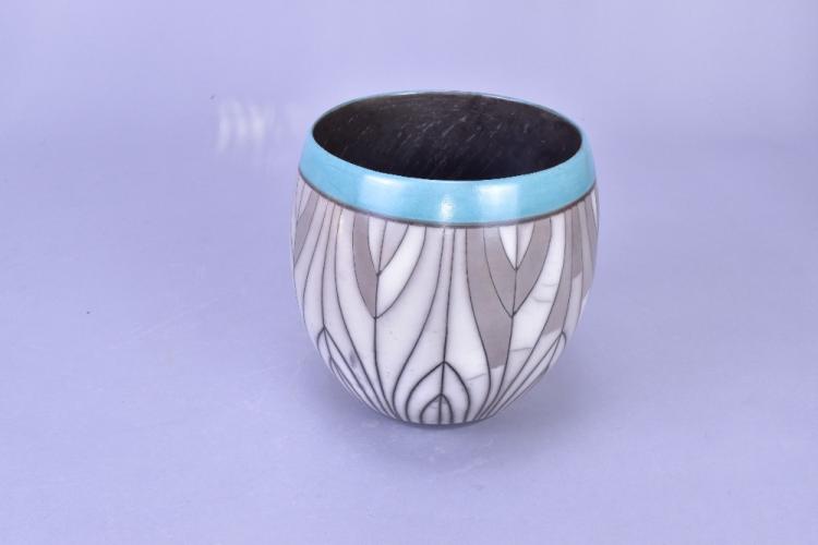Lot 39 of 473: ASHRAF HANNA (born 1967); a bulbous naked raku vessel with linear pattern and turquoise rim, incised ASH mark, height 16cm.