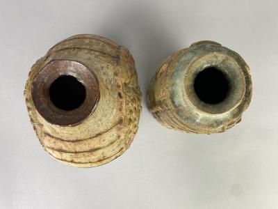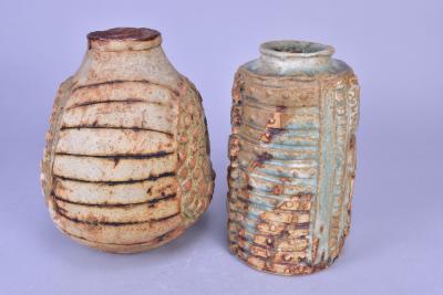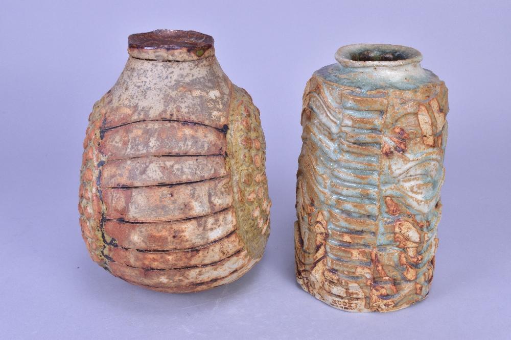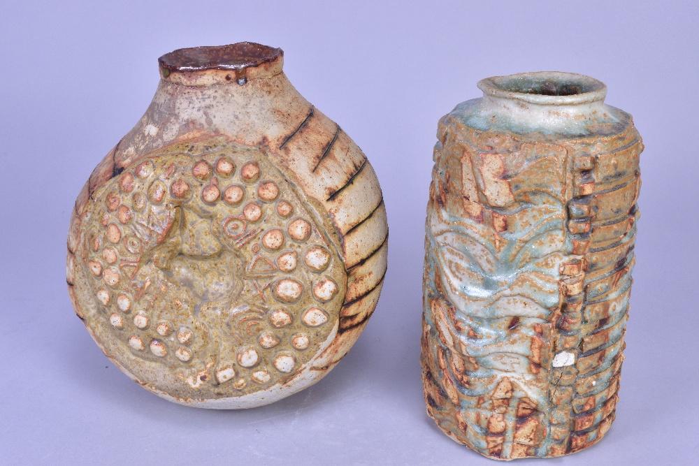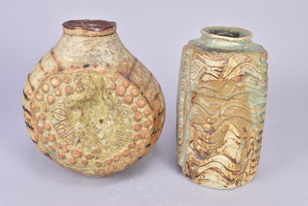 Lot 53 of 473: BERNARD ROOKE (born 1938); a flattened globular vase and a cylindrical vase both with deeply carved decoration, impressed mark to cylindrical vase, tallest 22cm (2). (D)