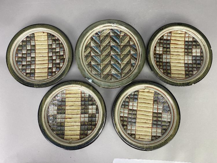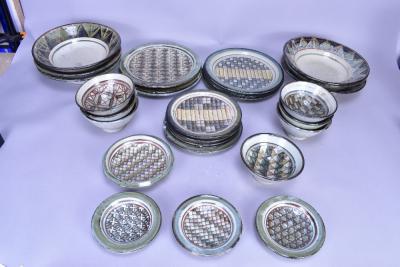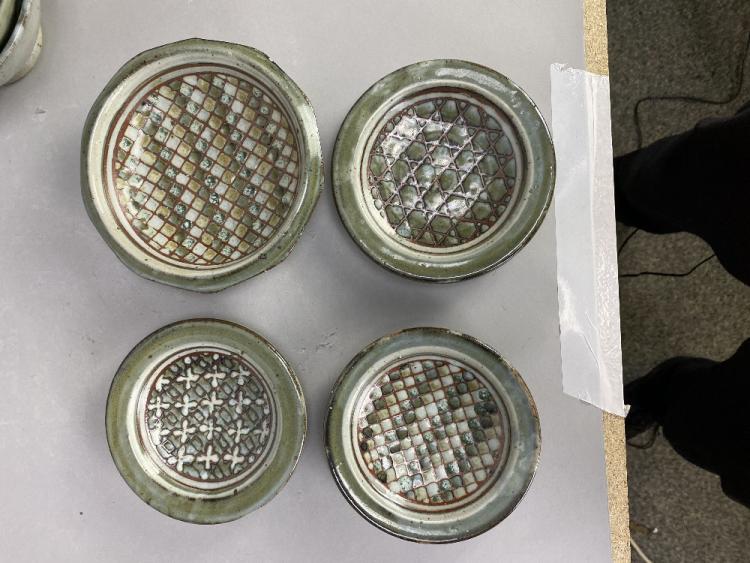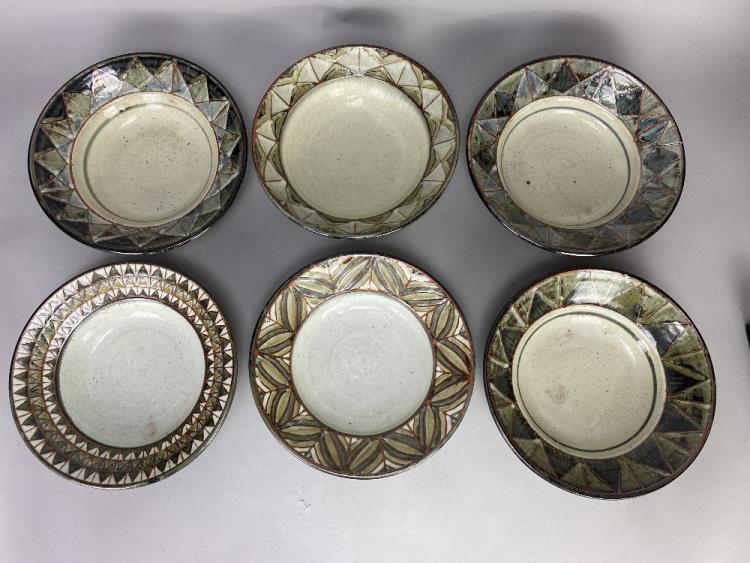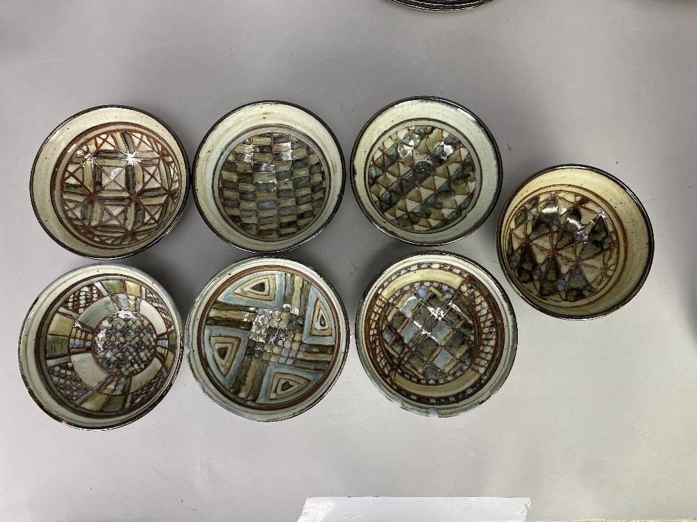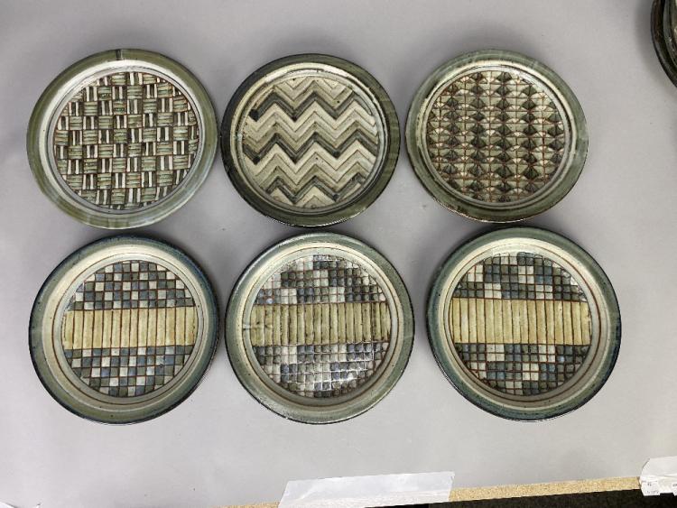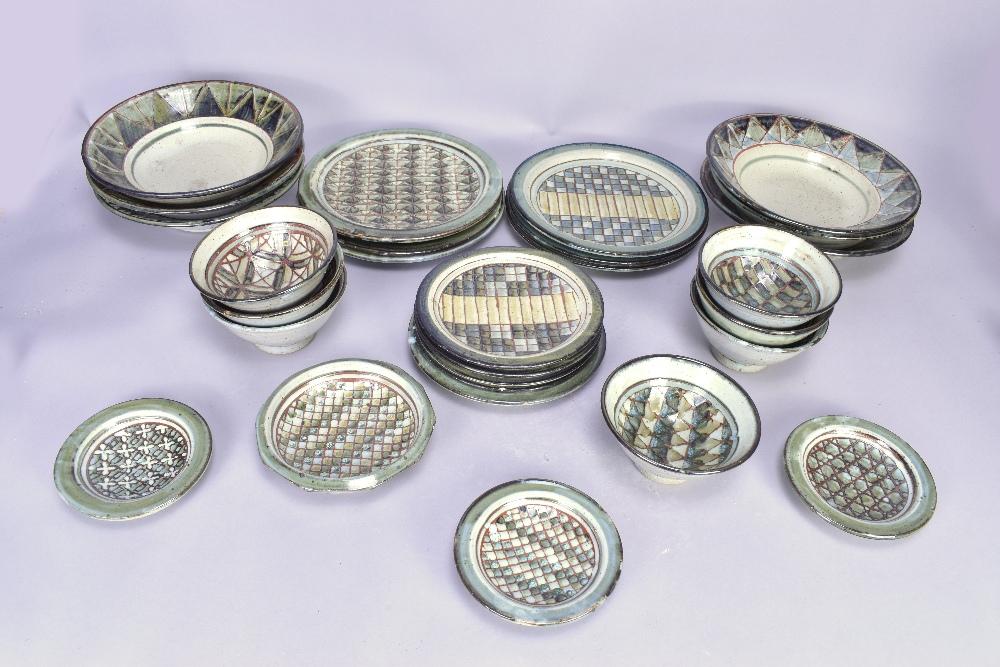 Lot 88 of 473: COLIN KELLAM (born 1942); a stoneware dinner service comprising six dinner plates, five side plates, six pasta bowls, seven smaller bowls and four dishes all decorated with geometric patterns, impressed marks, dinner plate diameter, 24.5cm, pasta bowl diameter 26cm (28). (D)