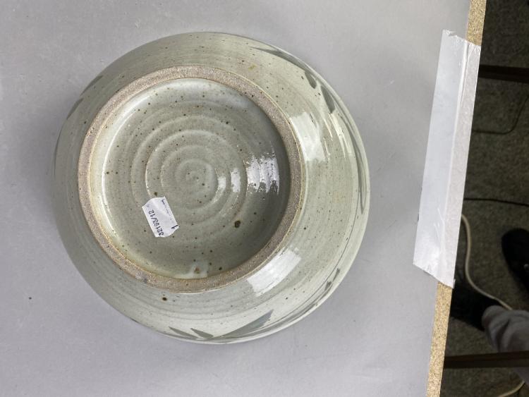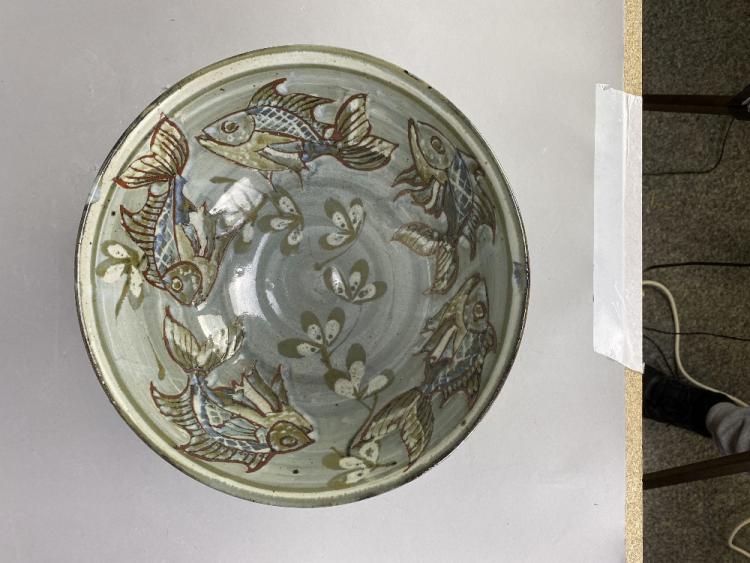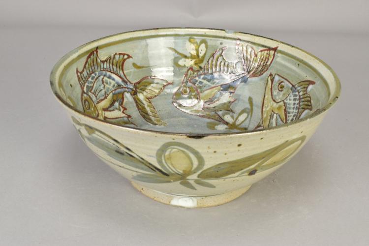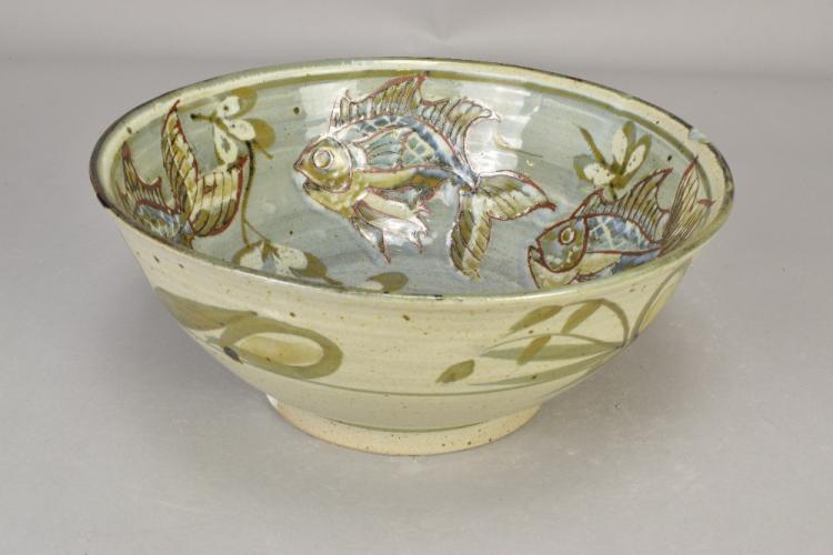 Lot 89 of 473: COLIN KELLAM (born 1942); a large stoneware bowl decorated with fish, impressed mark, diameter 28cm. (D)