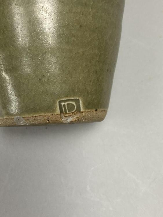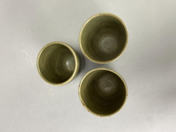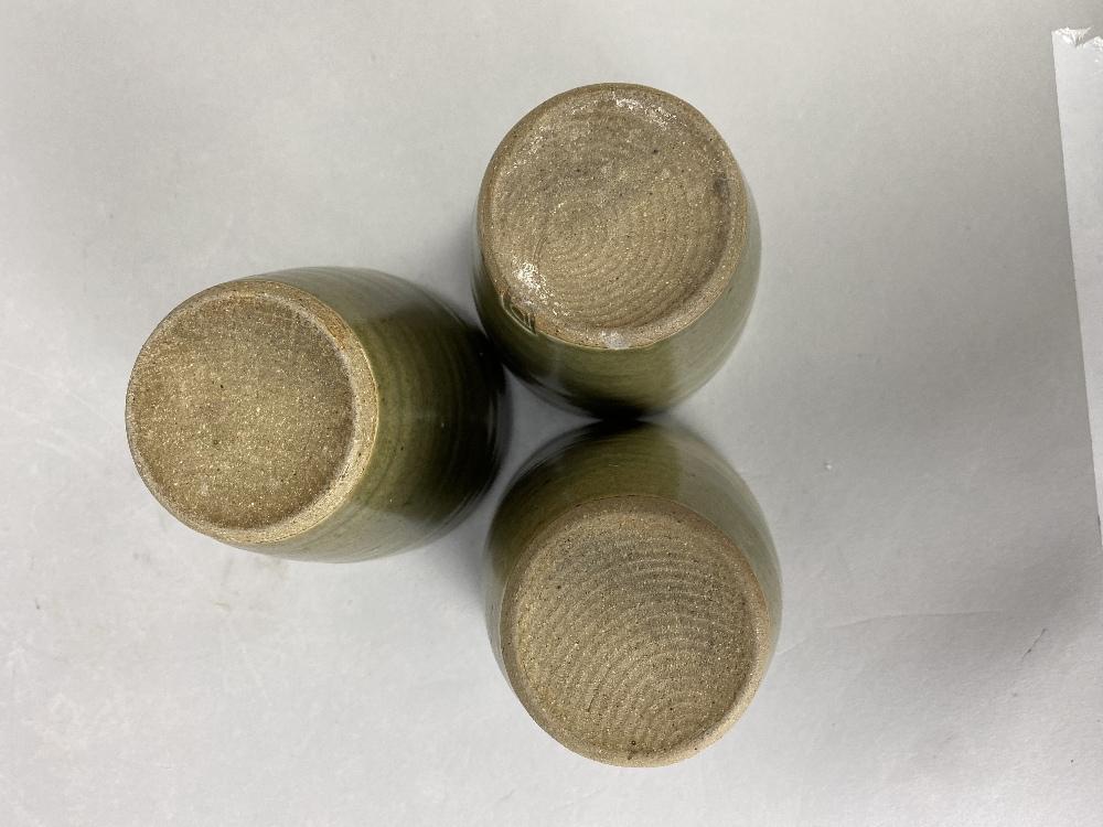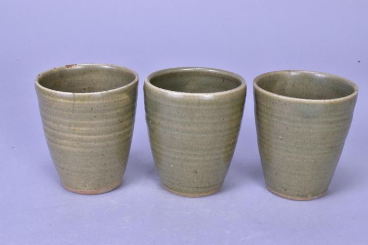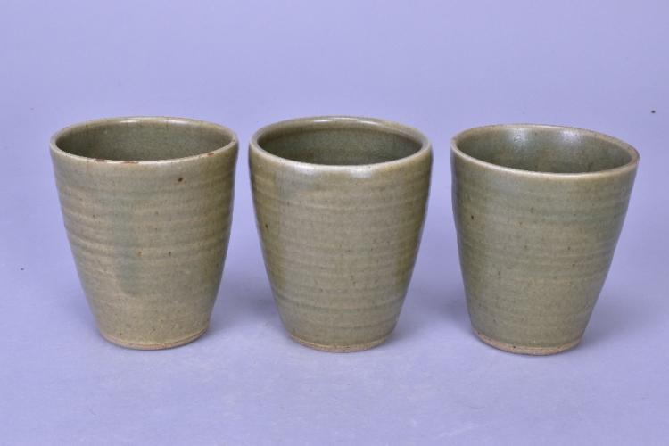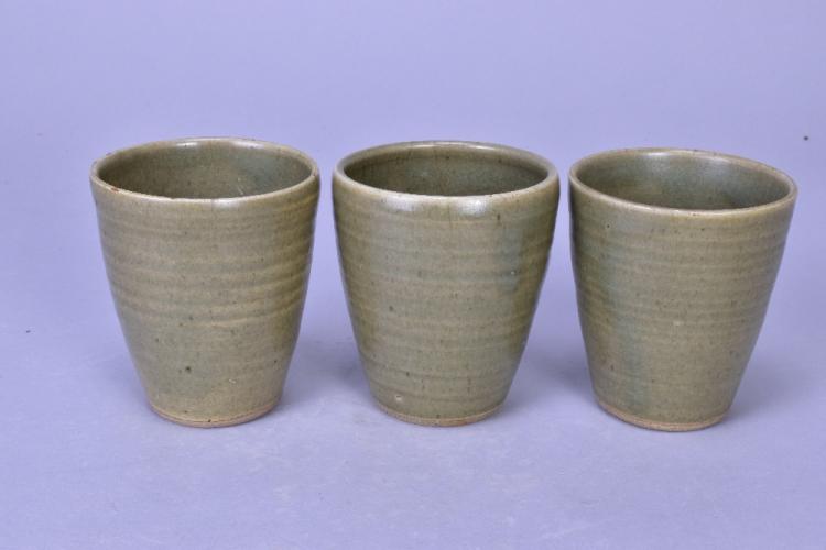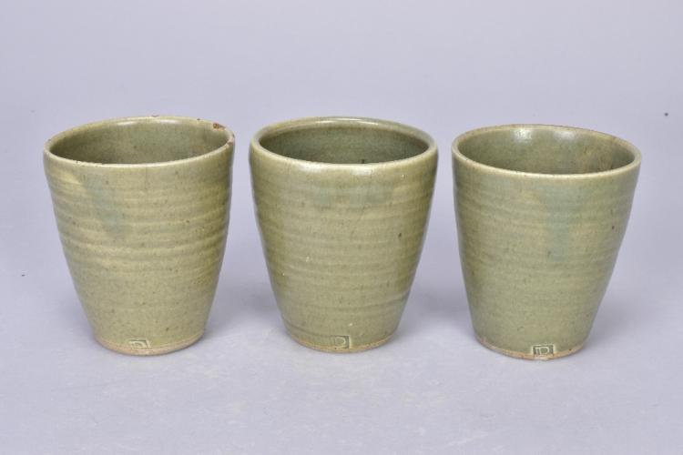 Lot 102 of 473: DAVID LEACH (1911-2005) for Lowerdown Pottery; a group of three stoneware beakers covered in green celadon glaze, impressed DL marks, height 10cm (3). (D)