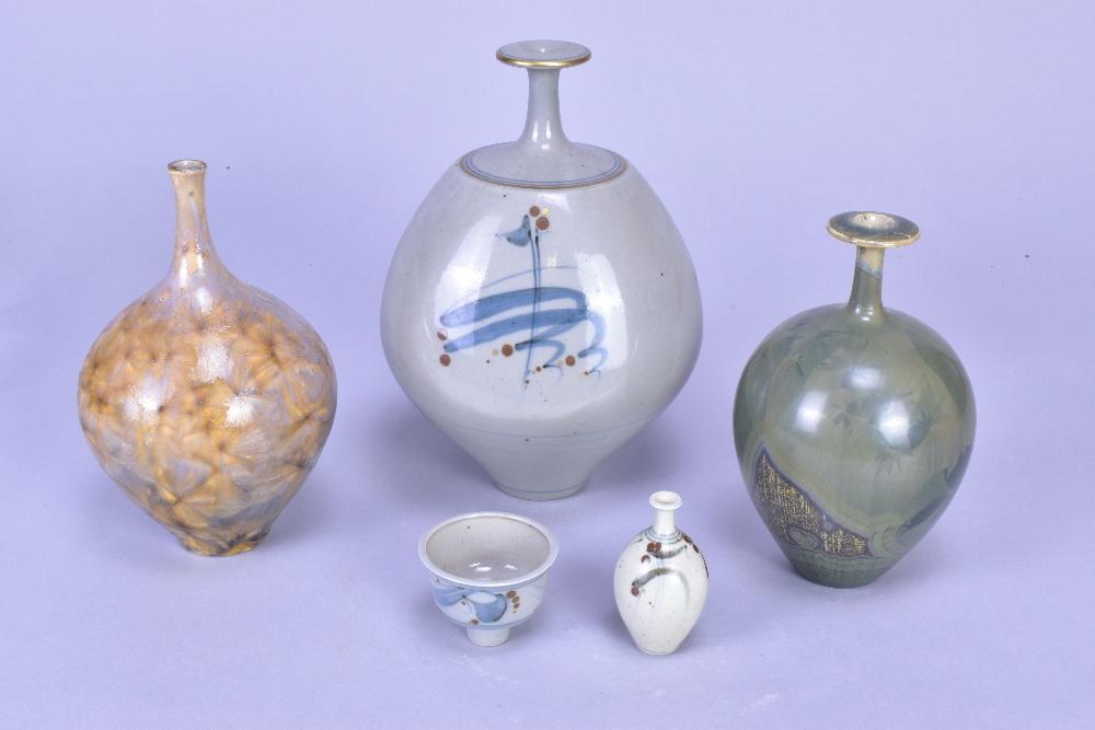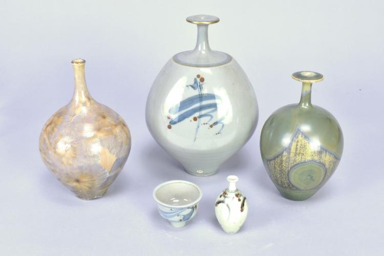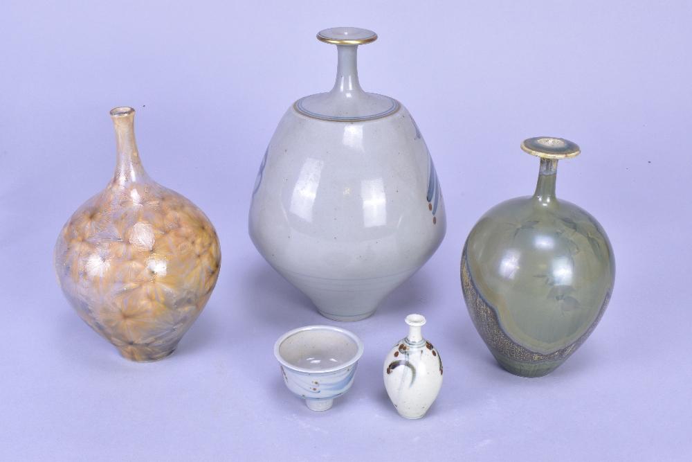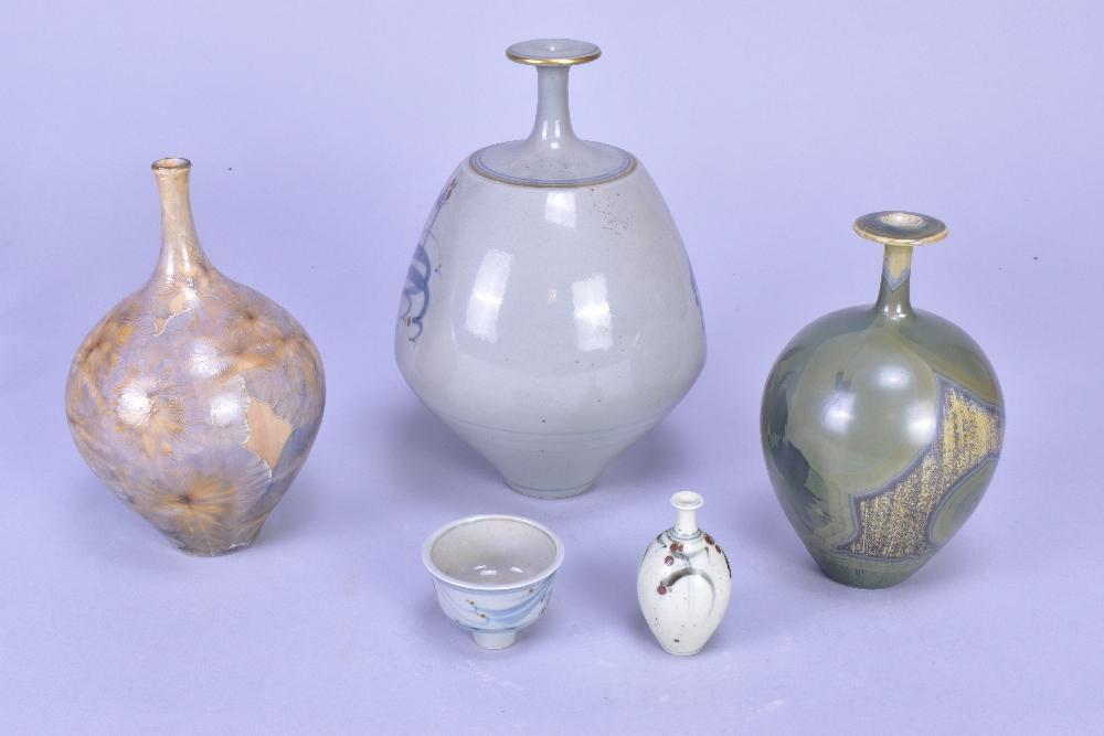 Lot 108 of 473: DEREK CLARKSON (1928-2013); a group of four stoneware and porcelain narrow necked bottles, two with crystalline glazes, and a miniature pedestal bowl, impressed DC marks and date codes, tallest 20cm (5). (D)