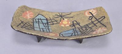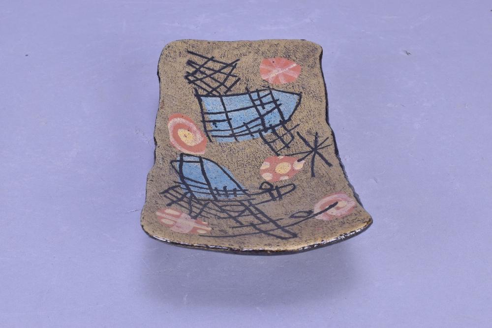 Lot 200 of 473: JOHN MALTBY (born 1936); a rectangular stoneware footed dish, 'Fishing Boat with Sea Shells', impressed M mark, length 21cm. (D)