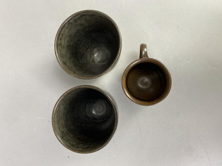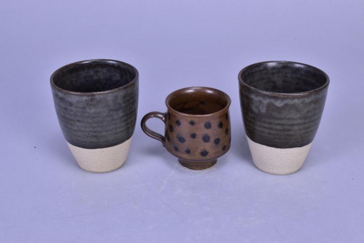 Lot 207 of 473: KENNETH QUICK (1931-1963) for Tregenna Hill Pottery; a pair of stoneware beakers and a cup, impressed pottery marks, tallest 9cm (3). (D)
