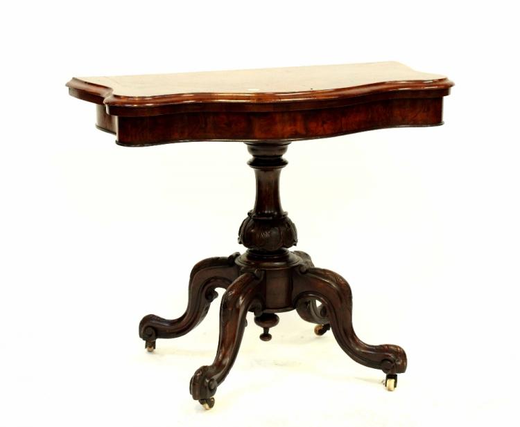 Lot 51 of 803: A William IV walnut fold-over serpentine top card table on tripod cabriole base, width 90cm, height 77cm.