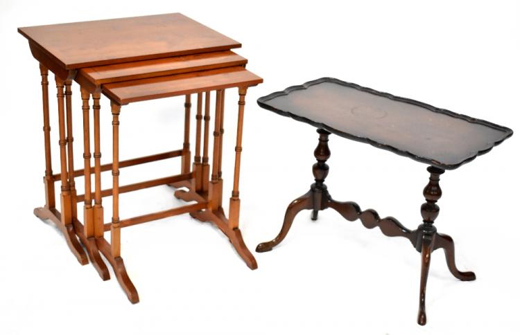 Lot 7 of 983: A reproduction yew wood nest of three tables, all with faux bamboo supports to cross-stretchers and a small reproduction mahogany coffee table (2).