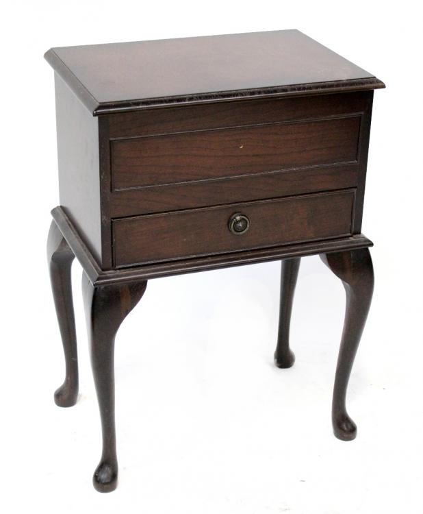 Lot 50 of 983: A Georgian-style stained wood sewing table with lift-up lid and single shelf on cabriole legs, height 67cm, width 48cm, depth 31cm.