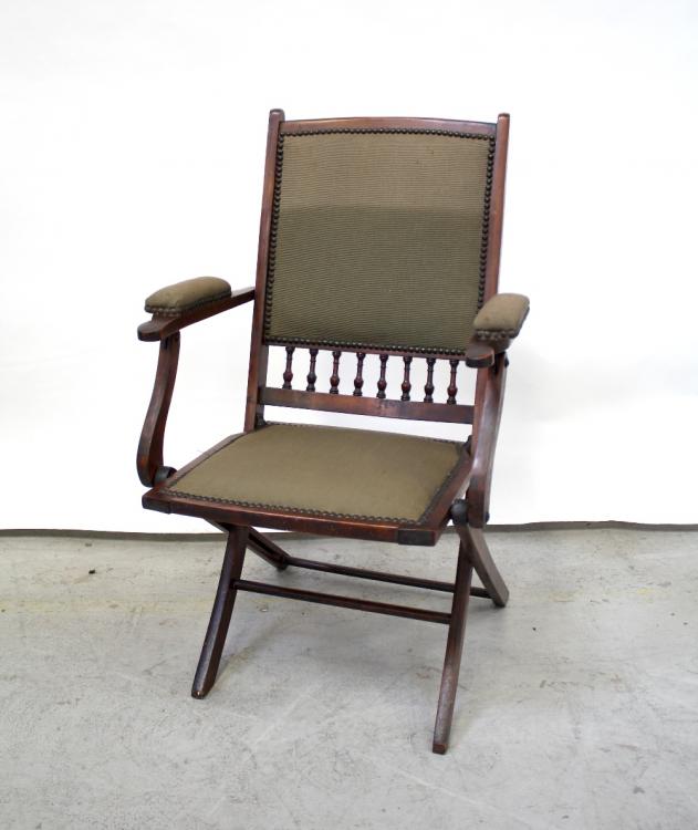 Lot 57 of 983: An upholstered mahogany folding chair with turned decoration to back.
