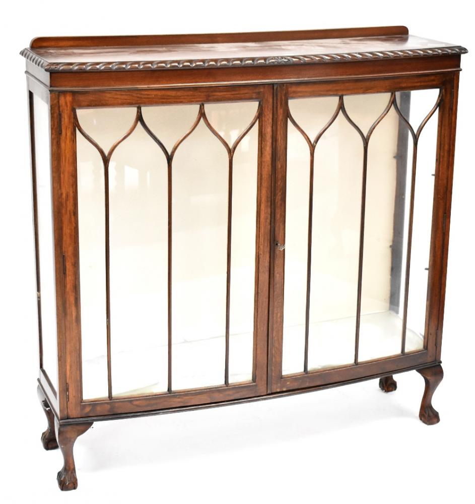 Lot 60 of 983: An oak two-door bow-fronted display cabinet with gadrooned decoration above pair of astragal glazed doors enclosing two shelves, raised on squat cabriole legs to ball and claw feet, height 120cm, width 121cm, depth 34cm.