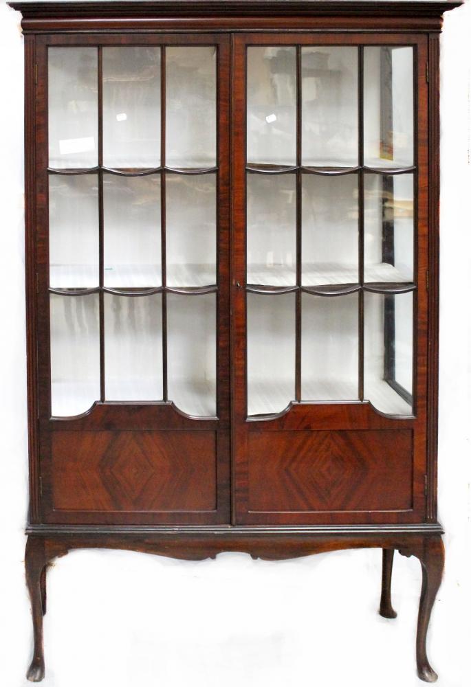 Lot 64 of 983: An Edwardian mahogany twin-door display cabinet, astragal glazed doors, two interior shelves, to shaped frieze and cabriole supports, 181 x 186cm.