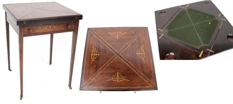 Lot 68 of 983: An Edwardian inlaid rosewood envelope table, one frieze drawer, to tapering supports and castors, when extended 79 x 79cm.