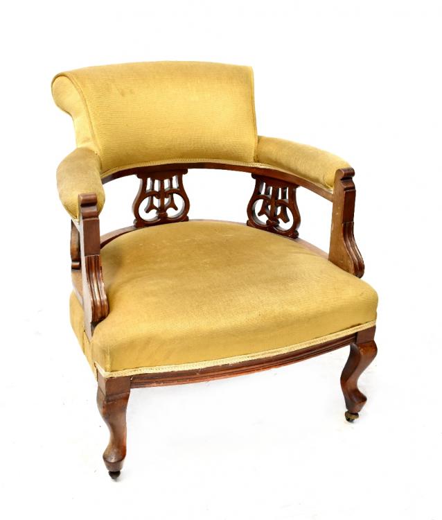 Lot 75 of 983: An Edwardian oak-framed tub chair, to front cabriole supports and castors.