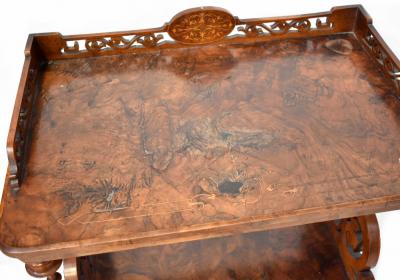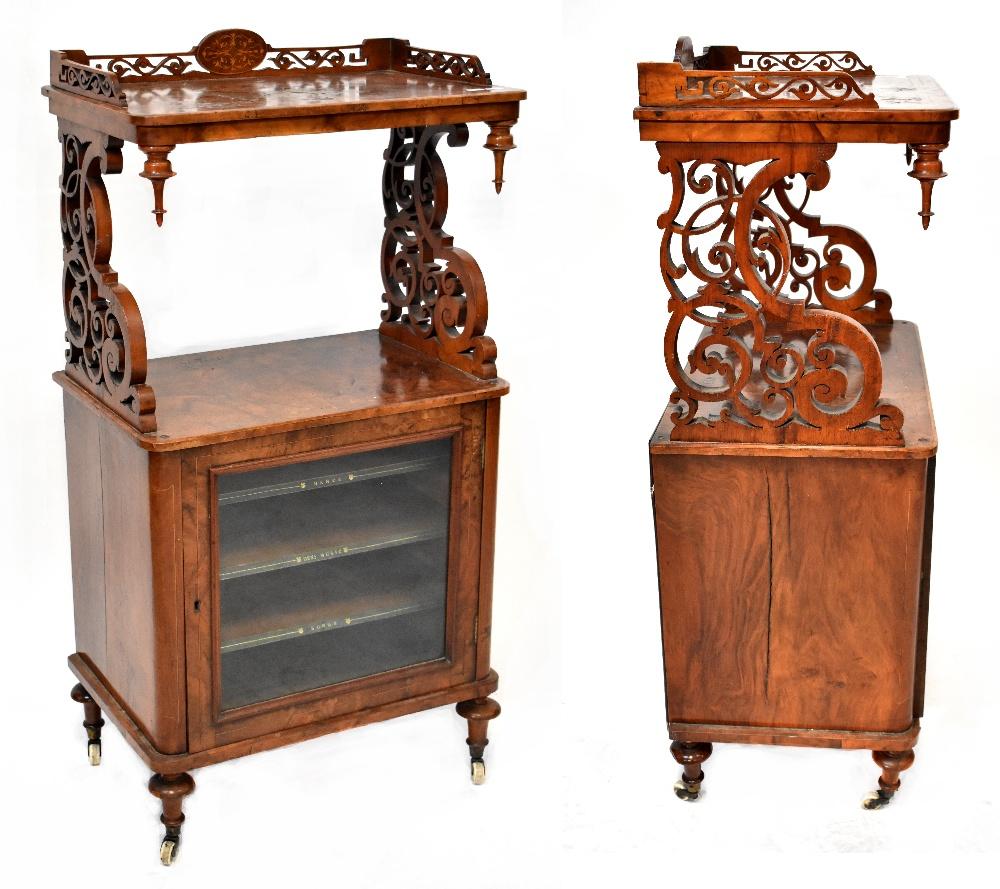 Lot 76 of 983: A Victorian walnut two-tier music cabinet, the upper tier with pierced gallery, on pierced scrolling supports above a base with three gilt-heightened shelves on turned feet to castors, height 111cm, width 58cm, depth 39cm.