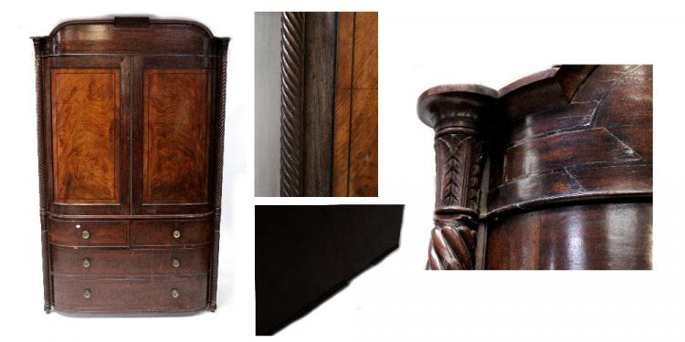 Lot 81 of 983: A Victorian mahogany wardrobe converted from a linen press, the bow front enclosing a railed interior with one brushing slide above four drawers, with wrythen column and acanthus leaf decoration, height 220cm, width 138, depth 65cm.