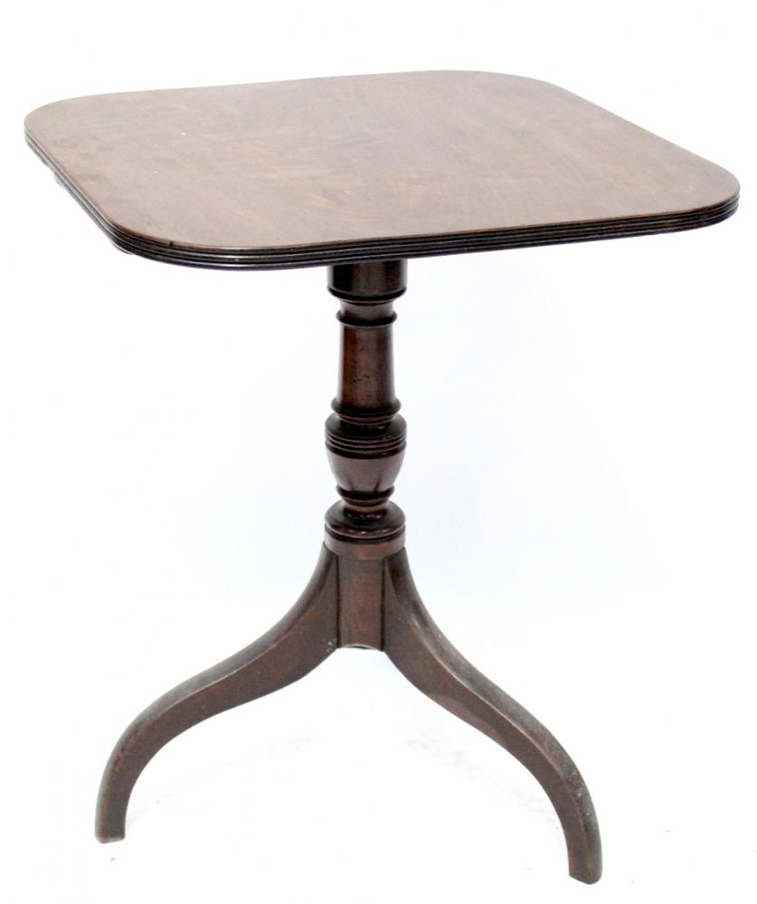 Lot 83 of 983: A Victorian mahogany square tilt-topped occasional table to turned central column and three outswept supports, height 73cm, width across top 59cm.