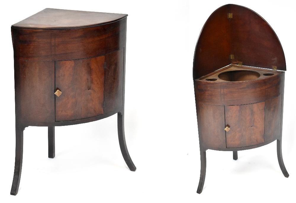 Lot 86 of 983: A Victorian mahogany inlaid corner wash stand with hinged top opening to reveal three circular cut-outs above single door, raised on outswept supports, height 83cm, width 60cm, depth 42cm.