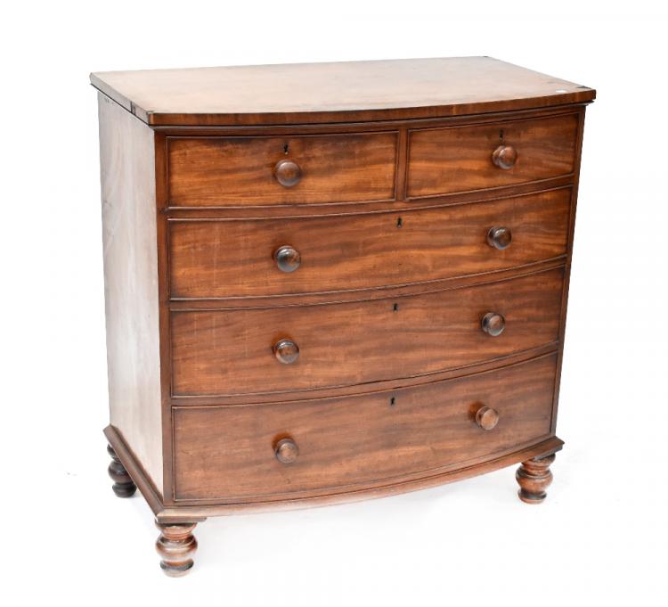 Lot 89 of 983: A Victorian mahogany bow-front two-over-three chest of drawers to turned baluster supports, 108 x 109cm.