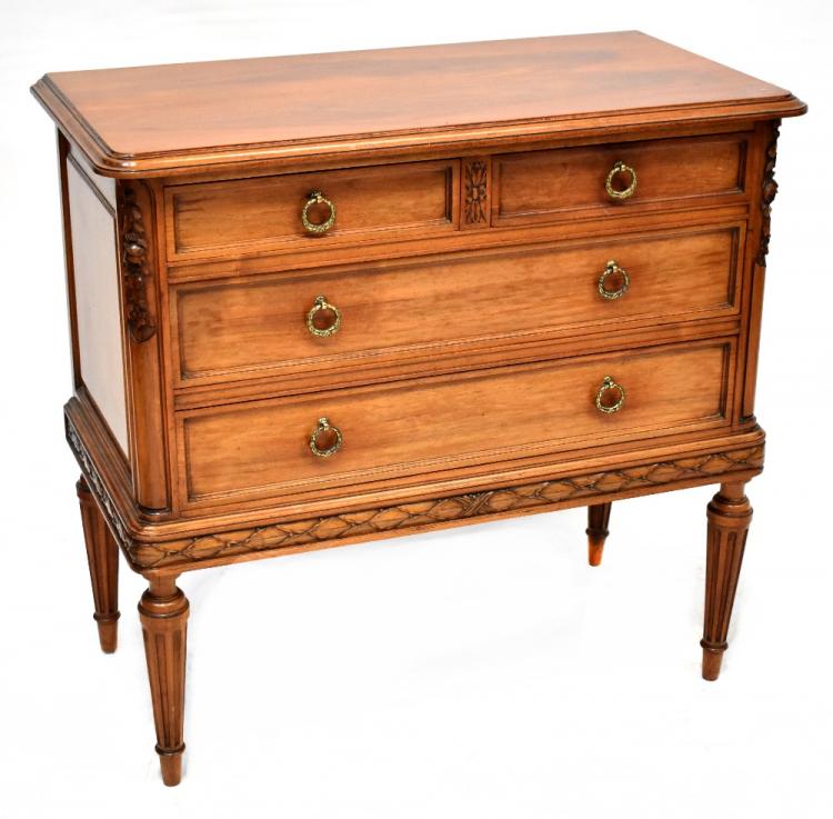 Lot 101 of 983: A French-style walnut chest of two short over three long drawers, with floral carving, laurel wreath gilt drop handles, on fluted tapering legs, height 86cm, width 89cm, depth 47cm.