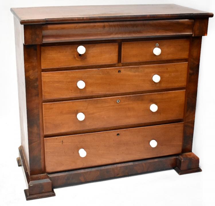 Lot 123 of 983: A 19th century mahogany Scotch chest with pillow drawer over two frieze drawers, over three long drawers, to recessed and stepped plinth base, 124 x 127cm.