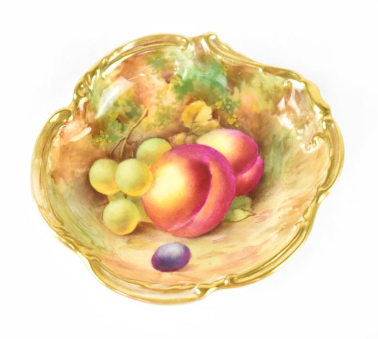 Lot 310 of 983: A Royal Worcester pin dish hand painted with fruit within a gilt C-scroll border, puce mark dated 1938, diameter 11.5cm.