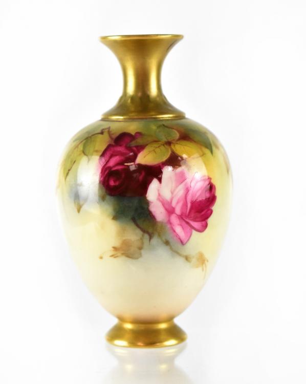 Lot 311 of 983: A Royal Worcester vase hand painted with roses, gilt highlighting, puce mark, shape 302B-H, dated 1926, height 10cm.