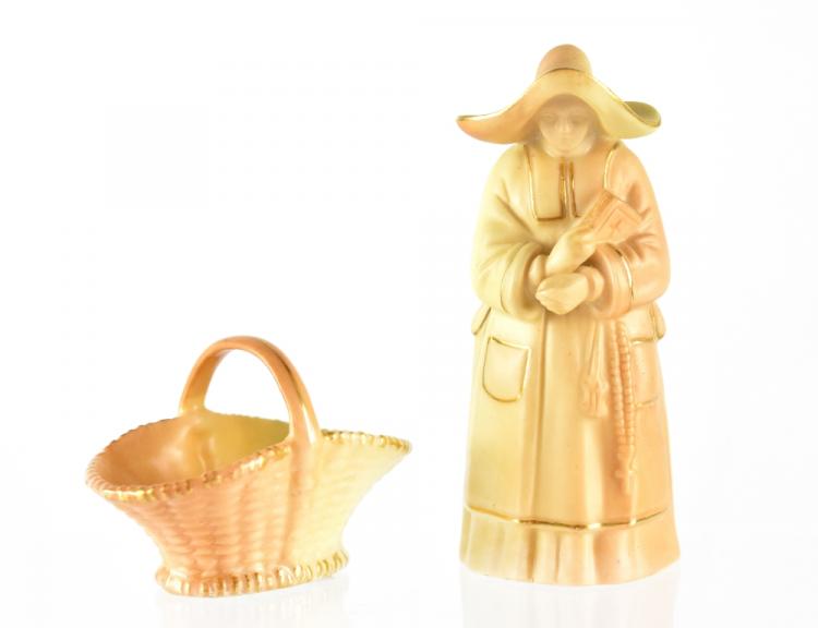 Lot 312 of 983: A Royal Worcester blush candle snuffer in the form of a nun, puce mark dated 1897, height 10cm and a similar basket, puce mark dated 1907, height 4.5cm (2).