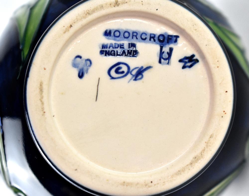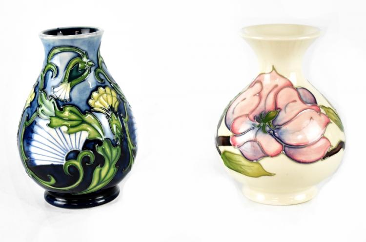 Lot 318 of 983: A Moorcroft Pottery 'Magnolia' pattern cream ground baluster-shaped vase, impressed marks to base, dated 1991 and a similar tube-lined vase decorated with fan-shaped flowers, impressed marks and blue initials to base, height 14cm (2).