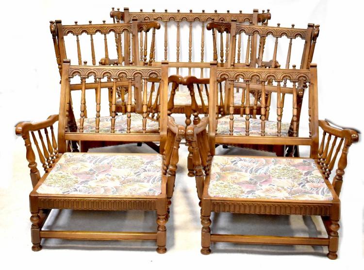 Lot 6 of 713: An Ercol oak Colonial-style five-piece cottage suite, design no.9322, comprising two-piece sofa, two low-back armchairs and two high-back armchairs (5).