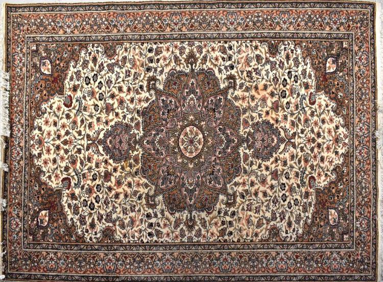 Lot 165 of 713: A Turkish wool Kayseri carpet with central medallion on a cream ground and within floral multi-borders, in cream, green, pink, black and red colourway, 298 x 196cm.