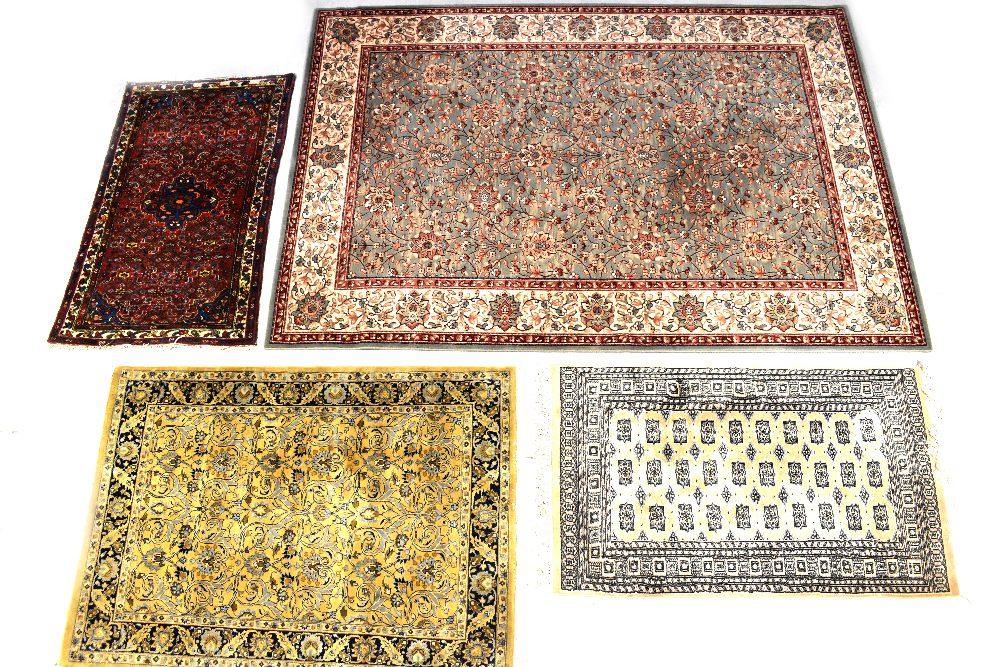 Lot 168 of 713: A Kashmir wool rug with floral and scrolling leaf motifs on a green ground within multi-borders, in green, brown, cream and red colourways, label 'G H Frith' 290 x 290cm, an Indo-Persian wool rug by the same company and two others (4).