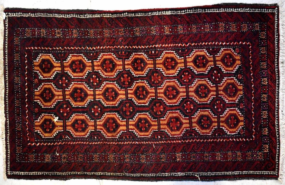 Lot 173 of 713: A Belouch wool carpet with central panel of multi hexagonal floral motifs within stepped borders, yellow, black and white colourway.
