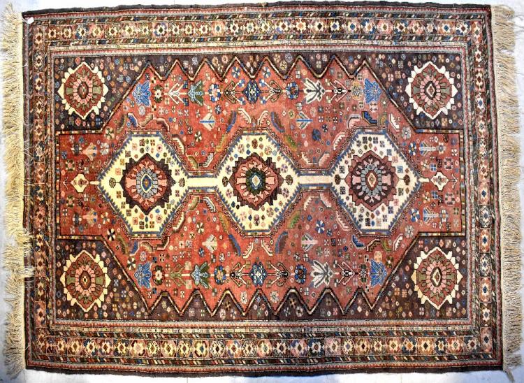 Lot 178 of 713: An Eastern wool rug with three central medallions with stylised floral motifs within a pink ground of floral motifs within stepped multi-borders, in pink, green, blue, cream and mauve colourway, 272 x 182cm.