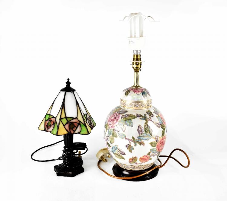 Lot 182 of 713: A large baluster table lamp, iridescent ground with floral and foliate gilt-heightened decoration, height 35cm and a small modern Tiffany-style lamp (2).