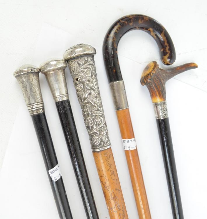Lot 38 of 2078: A tortoiseshell handled malacca shafted walking stick with silver collar, an antler handled ebonised walking stick and three silver capped walking canes, two with ebonised one with malacca shaft (5).