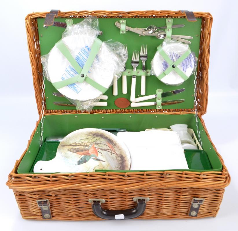 Lot 49 of 2078: A Jaguar wicker picnic basket containing flatware and various containers, width 61cm.