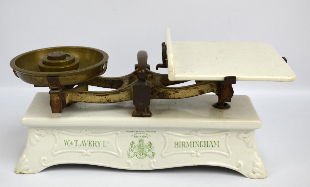 Lot 81 of 2078: A rare set of Victorian creamware scales inscribed 'W & T Avery Ltd, Birmingham' to both sides and with company emblem to each side, with original ceramic platform, brass pan and central powering handle, sold with three associated stacking weights, the ceramic base 55.5cm long.
