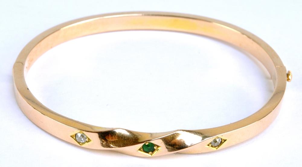 Lot 1661 of 2078: A 15ct yellow gold hollow snap bangle set with round cut emerald and two diamonds to twist decorated central section, aperture 5.9 x 5cm, approx 11.3g (safety chain missing).