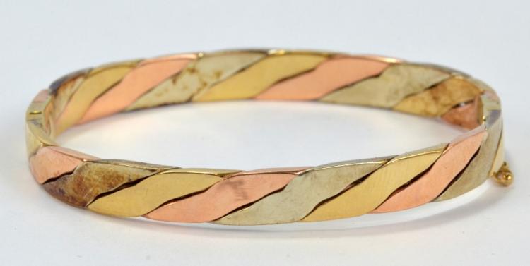 Lot 1662 of 2078: A 9ct three tone gold hinged snap bangle, width approx 6.4cm, approx 27.8g.