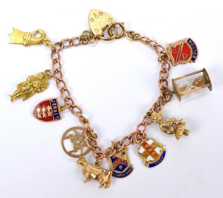 Lot 1665 of 2078: A 9ct yellow gold charm bracelet supporting a number of charms including an imp, hourglass, cow etc. Length approx. 17cm, approx. 22g.