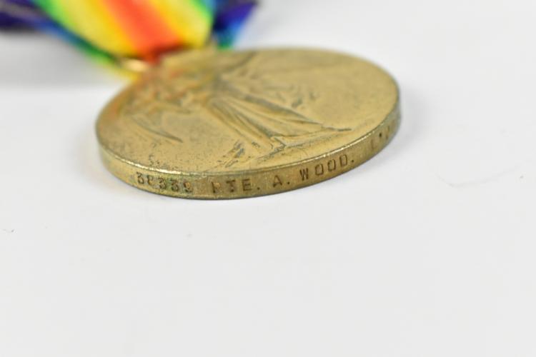 Lot 12 of 1032: A World War I War and Victory Medal duo awarded to 38339 Pte. A. Wood L'Pool. R. and a single Victory Medal awarded to 49181 Pte. J.Walsh L'Pool. R. (3).