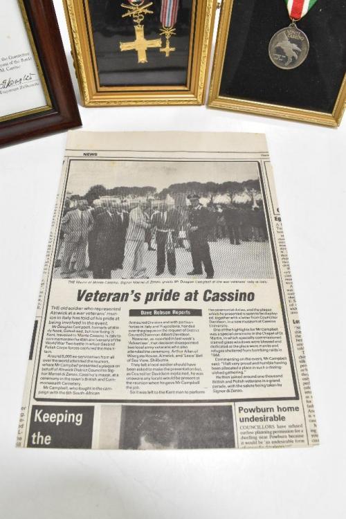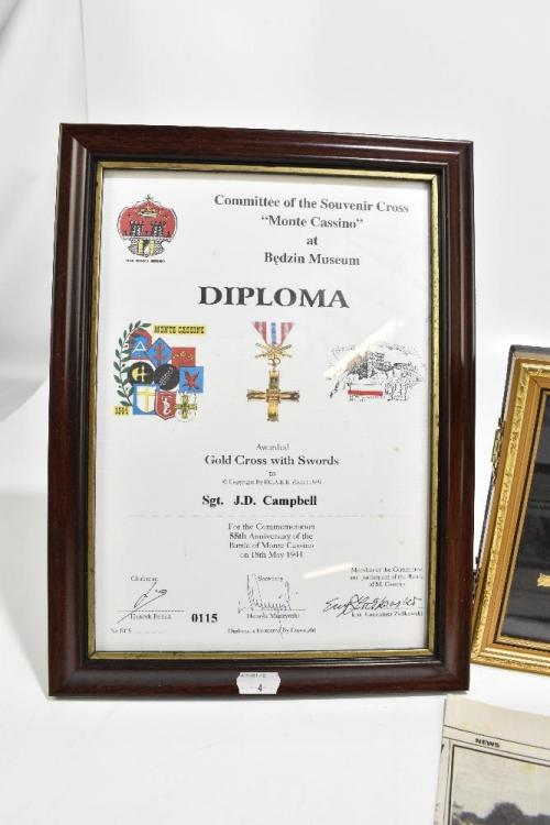 Lot 38 of 1032: A Monte Cassino Gold Cross with Swords medal and miniature and further commemorative medal awarded to Sgt. J.D. Campbell with certificate and newspaper clipping.