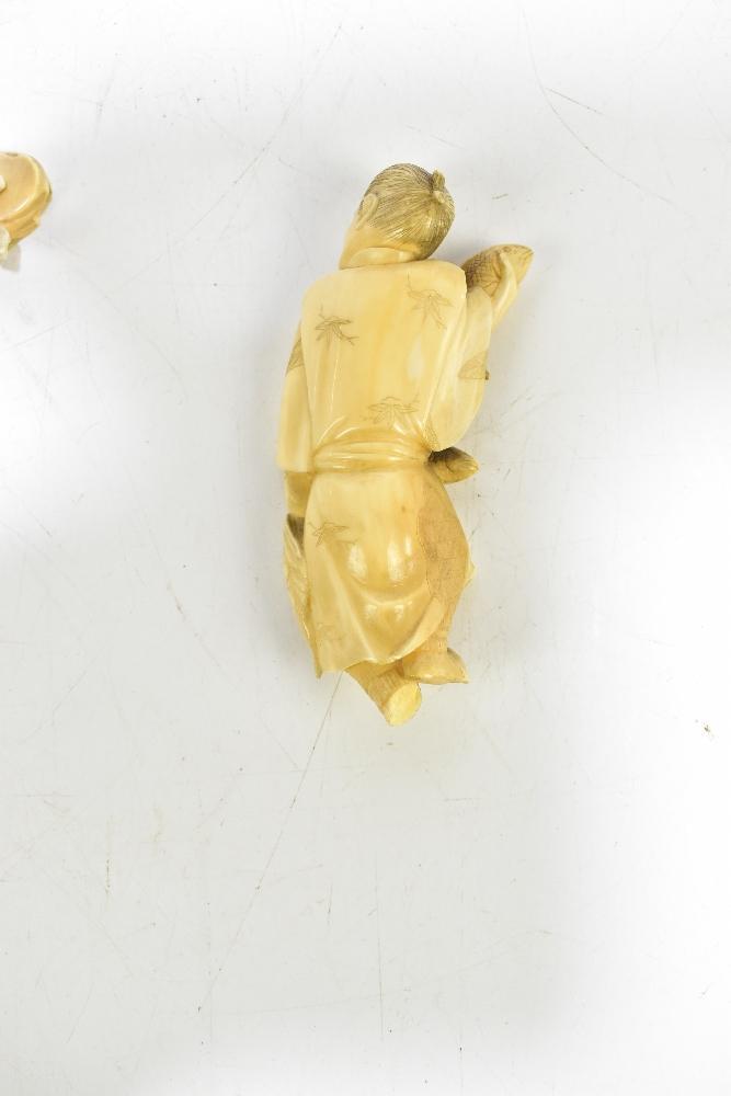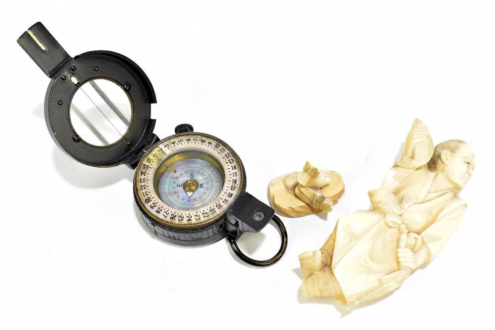 Lot 813 of 1032: A Japanese Meiji period carved ivory okimono depicting a fisherman (af) and a T.G. & Co London Mk. III WWII compass (2).