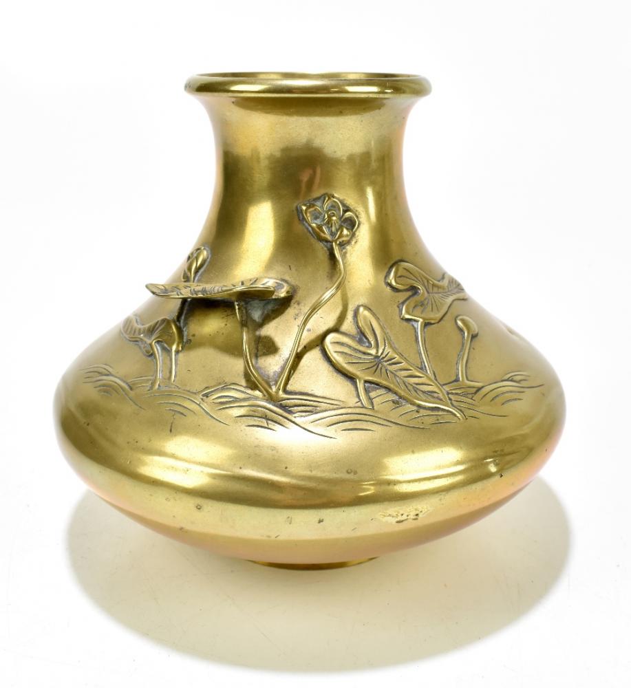 Lot 815 of 1032: A Japanese Meiji period brass vase relief decorated with floral motifs, height 19cm.