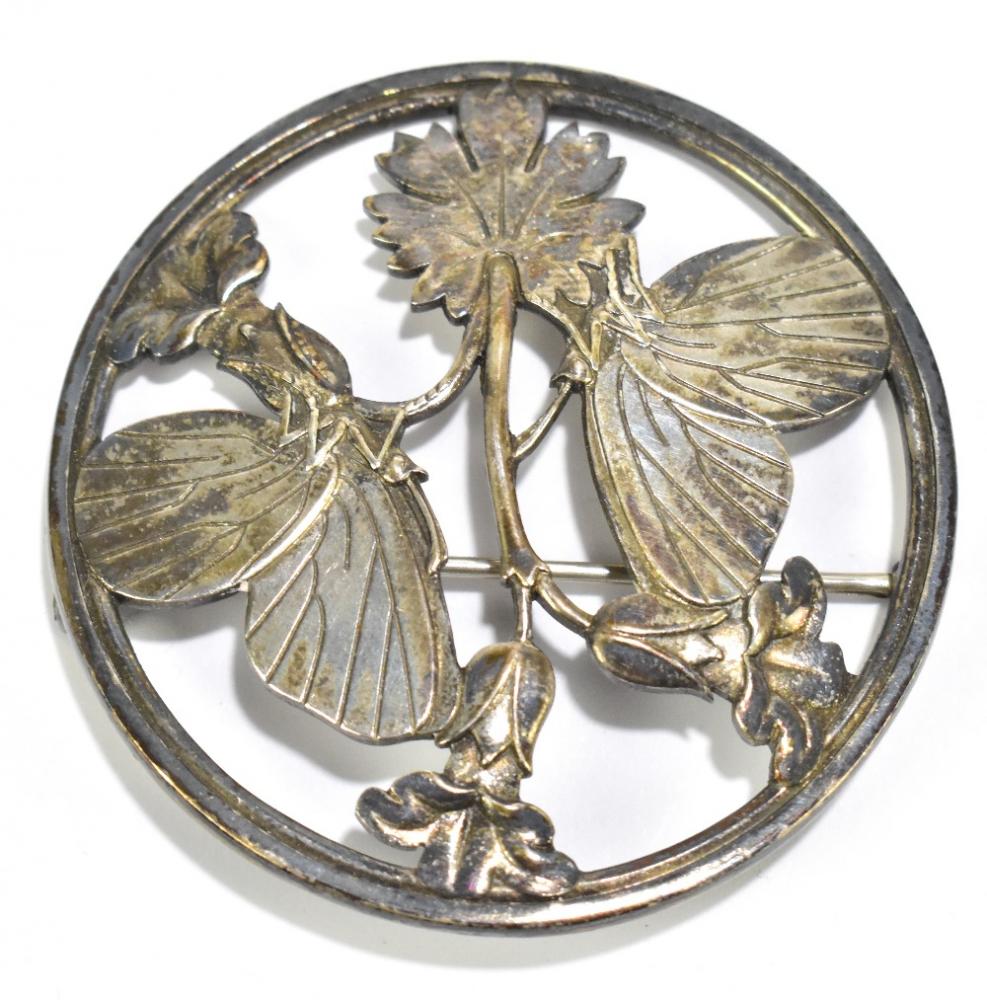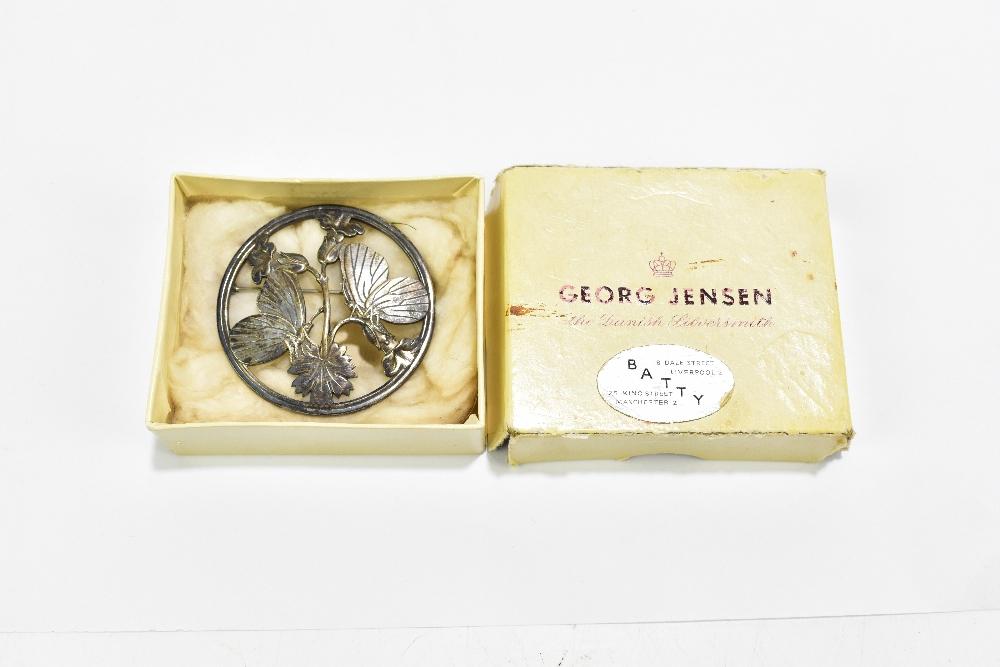 Lot 824 of 1032: ARNO MALINOWSKI FOR GEORG JENSEN; a sterling silver butterfly brooch of circular form with pierced detail, impressed marks No.283 verso, diameter 5.5cm, fitted in original card box.