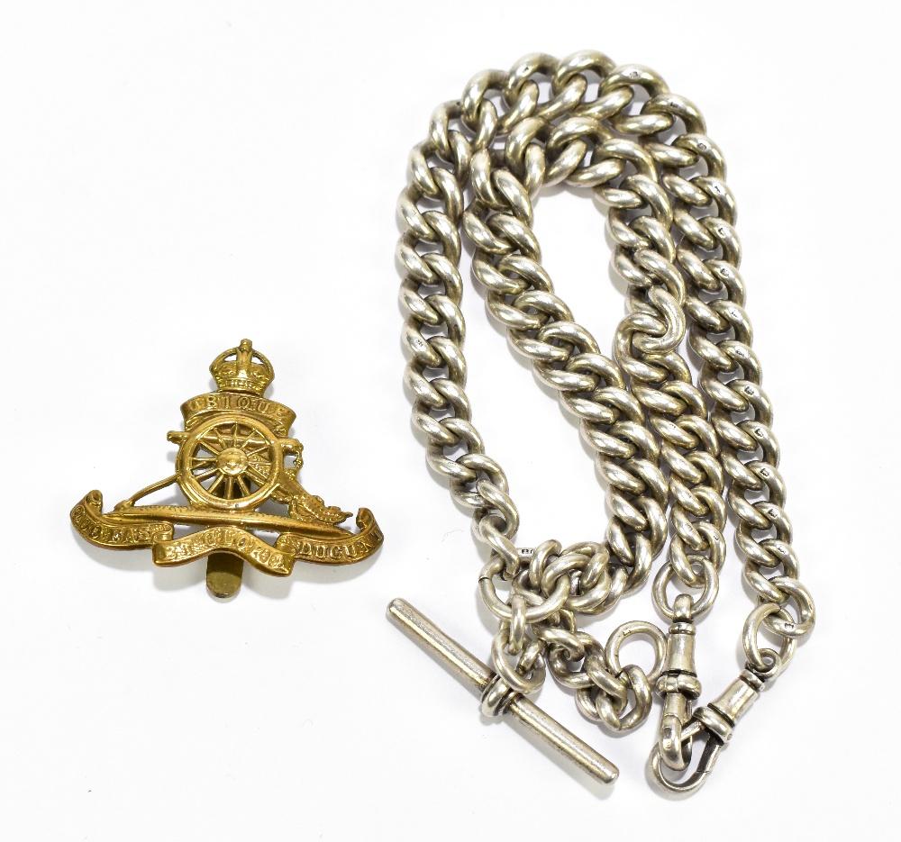 Lot 826 of 1032: A hallmarked silver Albert chain with T-bar, overall length 41cm, approx 3.3ozt/103g, and a brass Royal Artillery brooch (2).