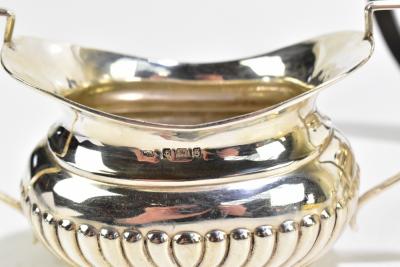 Lot 832 of 1032: WILLIAM AITKEN; an Edward VII hallmarked silver three piece tea set comprising teapot with ebonised handle, length 23.8cm, twin handled sugar bowl and cream jug, all with gadrooned detail, Birmingham 1906, approx 19.2ozt/598g (3).