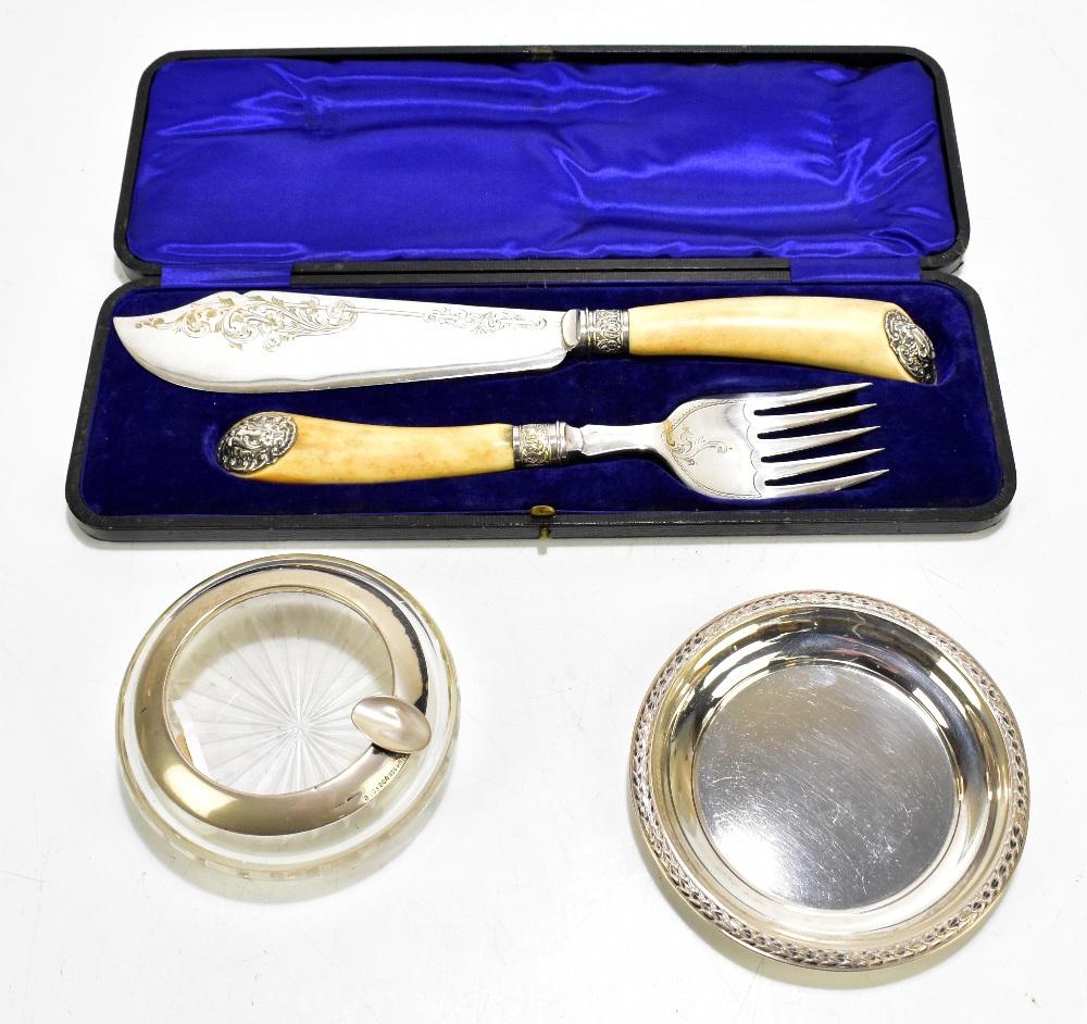Lot 842 of 1032: An 835 grade silver and glass ashtray, also an 800 grade silver dish and a pair of Victorian silver plated horn handled fish servers (4).
